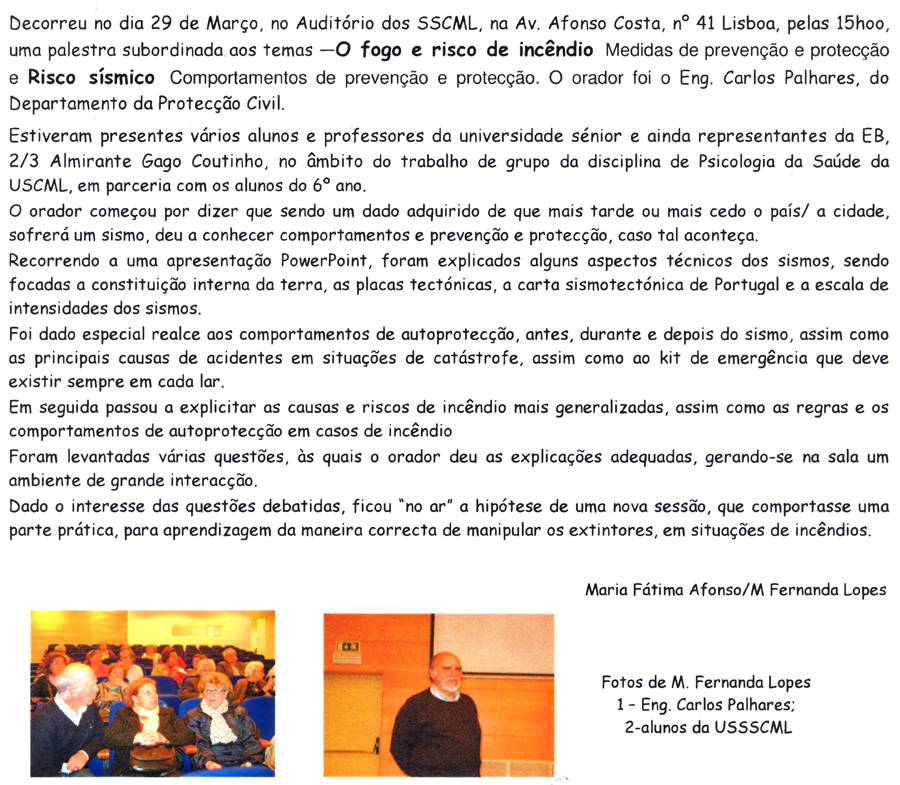 Sessão temática sobre sismos e outros riscos na cidade de Lisboa realizada nas instalações da Protecção Civil de Lisboa e dedicada aos voluntários da cidade.