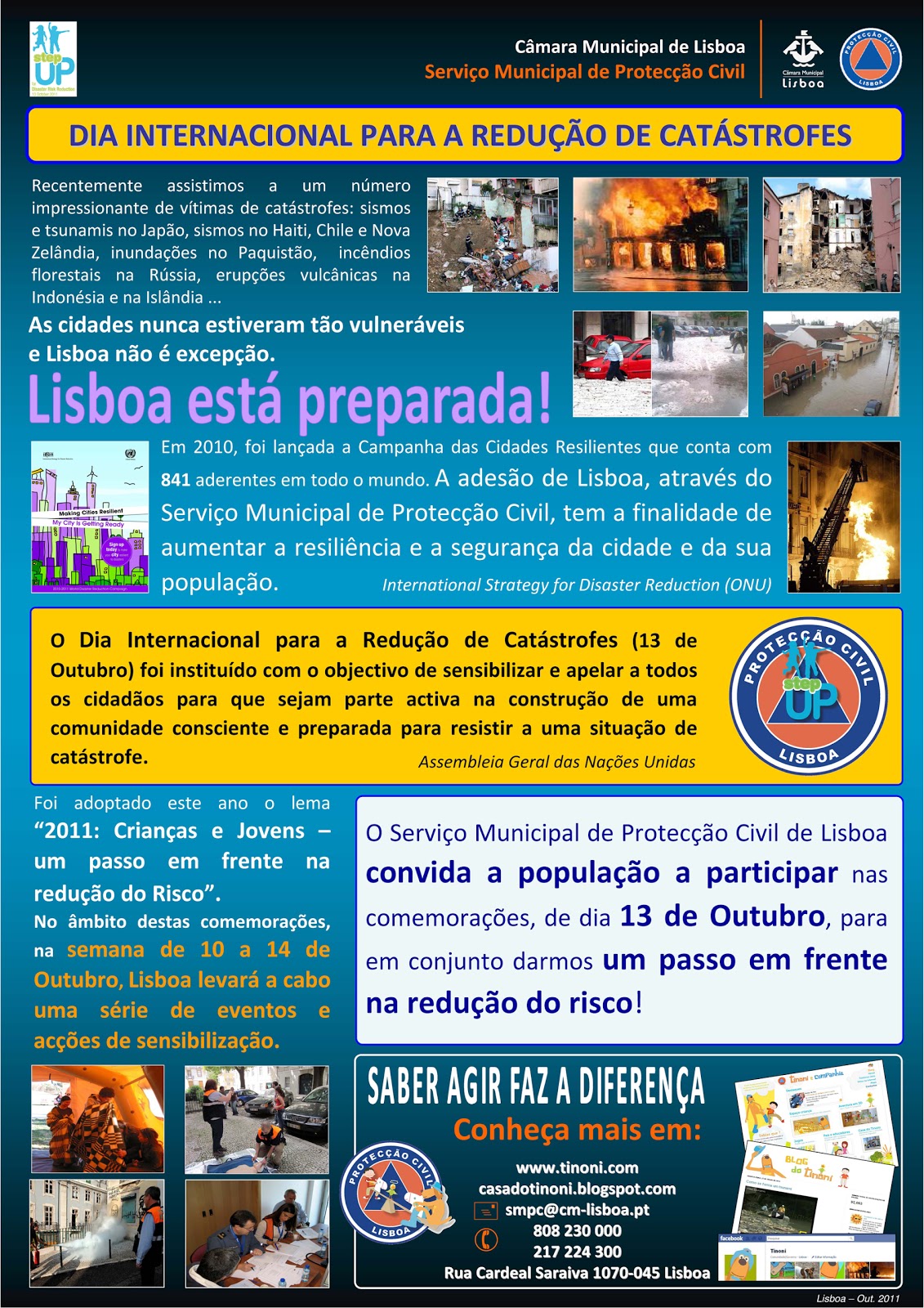 O Serviço Municipal de Protecção Civil de Lisboa convida a população a participar nas comemorações, de dia 13 de Outubro, para em conjunto darmos um passo em frente na redução do risco! DIA INTERNACIONAL PARA A REDUÇÃO DE CATÁSTROFES. Foi adoptado este ano o lema “2011: Crianças e Jovens –um passo em frente na redução do Risco”. No âmbito destas comemorações, na semana de 10 a 14 de Outubro, Lisboa levará a cabo uma série de eventos e acções de sensibilização.