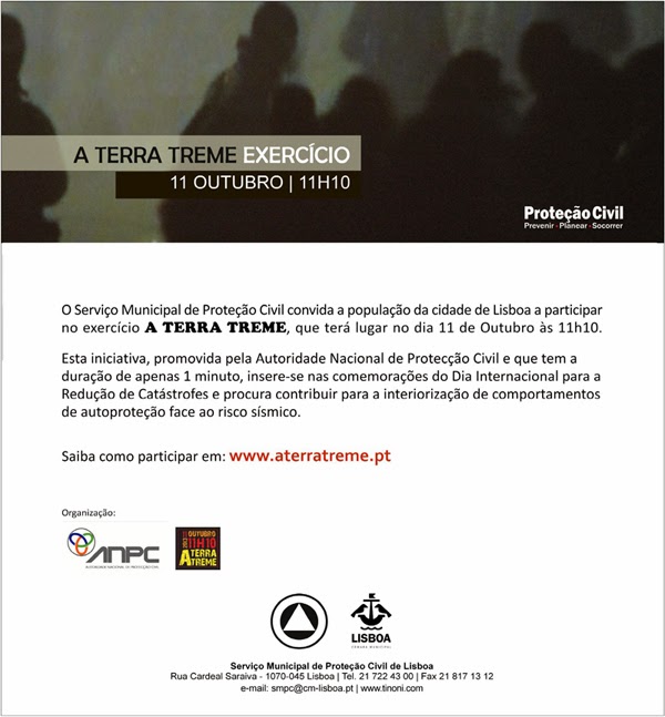 O Serviço Municipal de Protecção Civil de Lisboa, irá promover uma série de iniciativas na semana de 10 a 14 de Outubro, destinadas a alunos de diversos graus de ensino ,a voluntários de Protecção Civil e a toda a população. Brevemente existirão mais notícias. Participe e envie sugestões.
