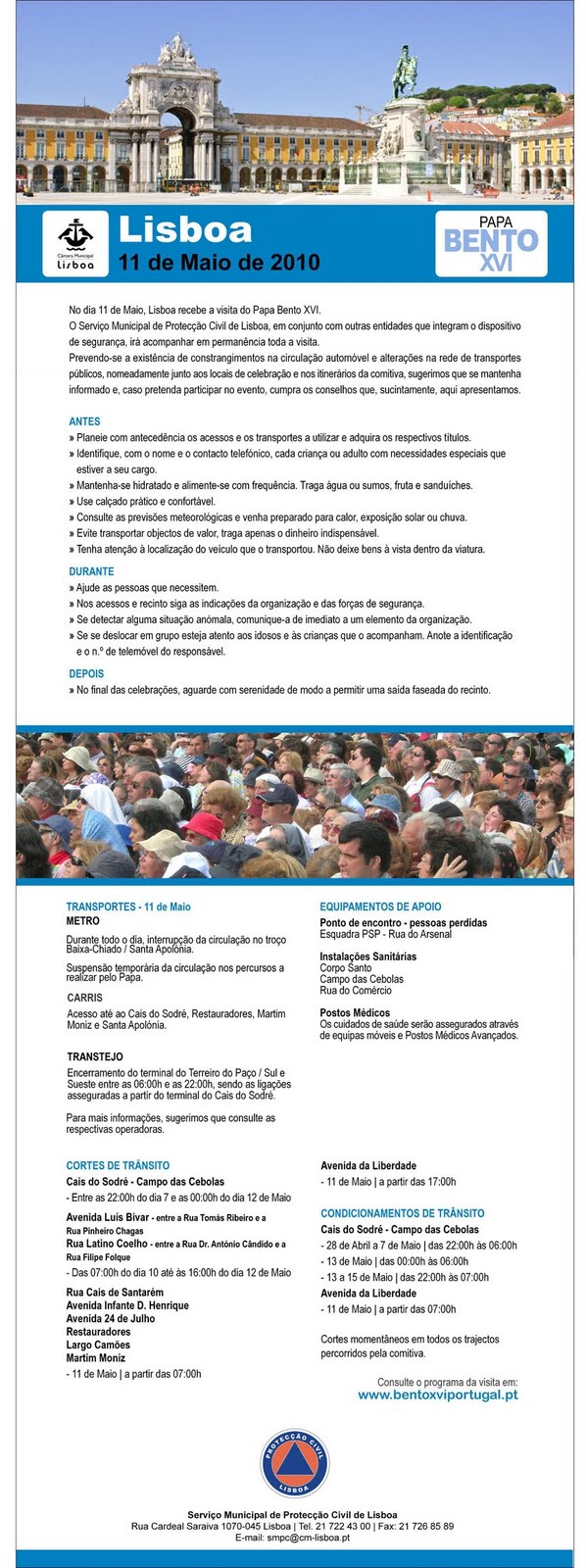 No dia 11 de Maio, Lisboa recebe a visita do Papa Bento XVI. O Serviço Municipal de Protecção Civil de Lisboa, em conjunto com outras entidades que integram o dispositivo de segurança, irá acompanhar em permanência toda a visita.