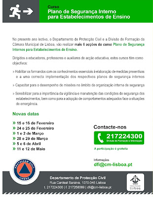 Com o objectivo de contribuir para a melhoria das condições de segurança das escolas do município de Lisboa, o Departamento de Protecção Civil vai promover cursos de formação sobre Planos de Segurança Internos para Estabelecimentos de Ensino.